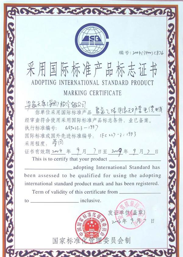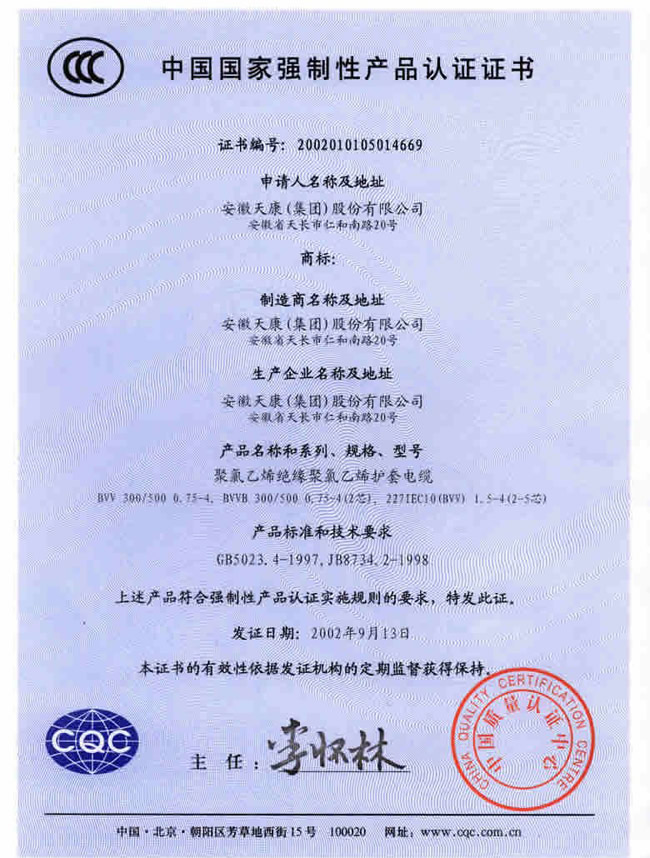 聚氯乙烯绝缘电缆国标证书